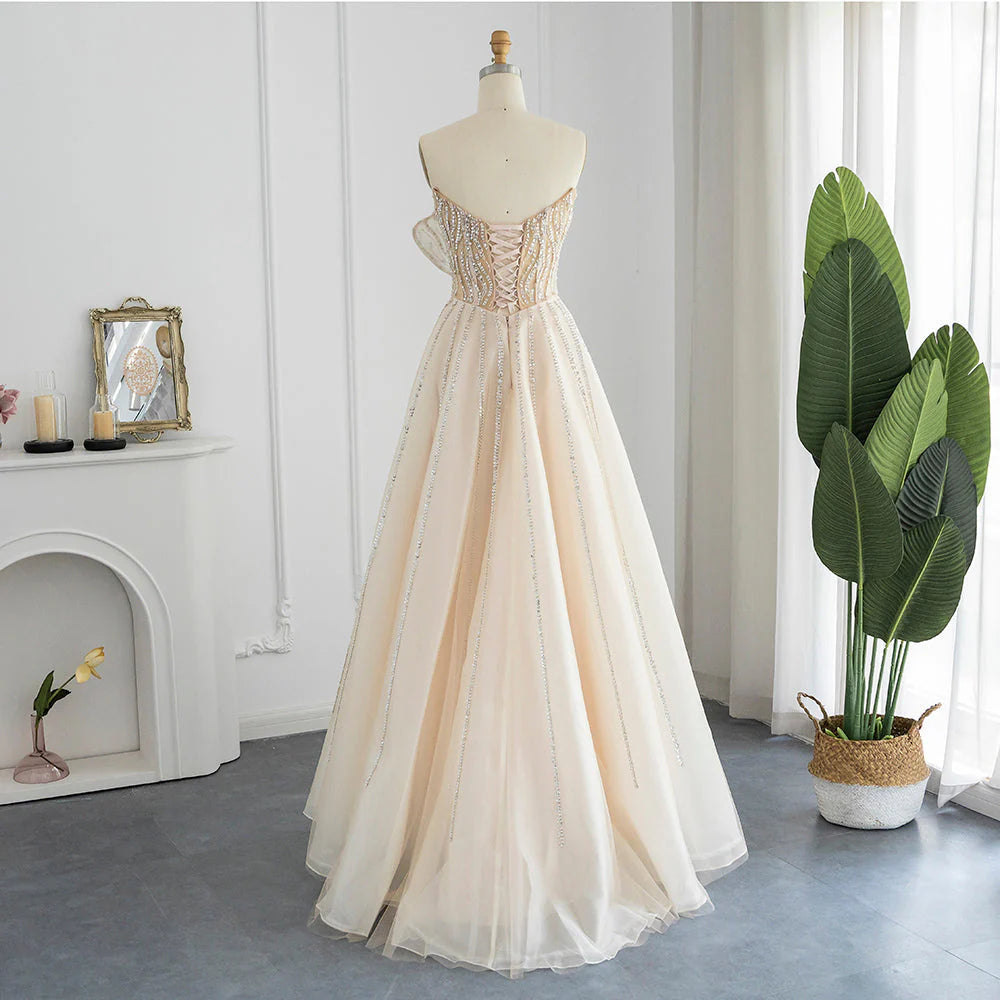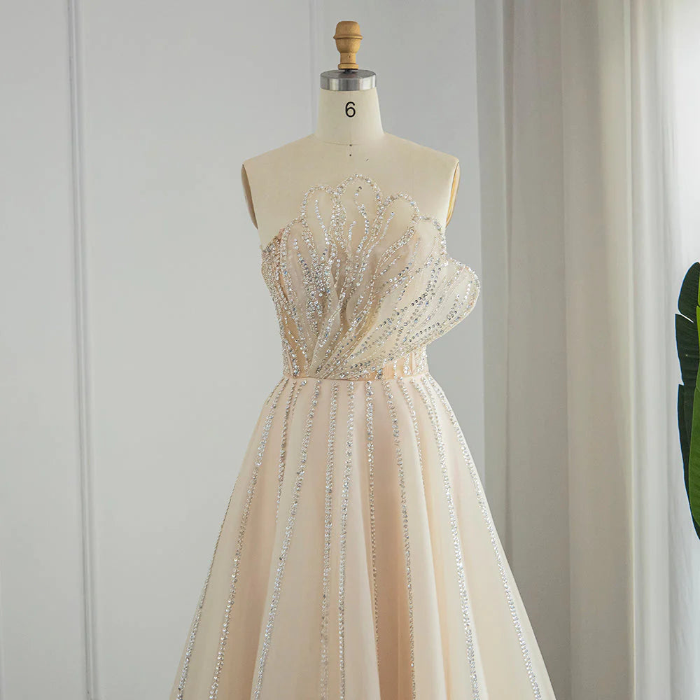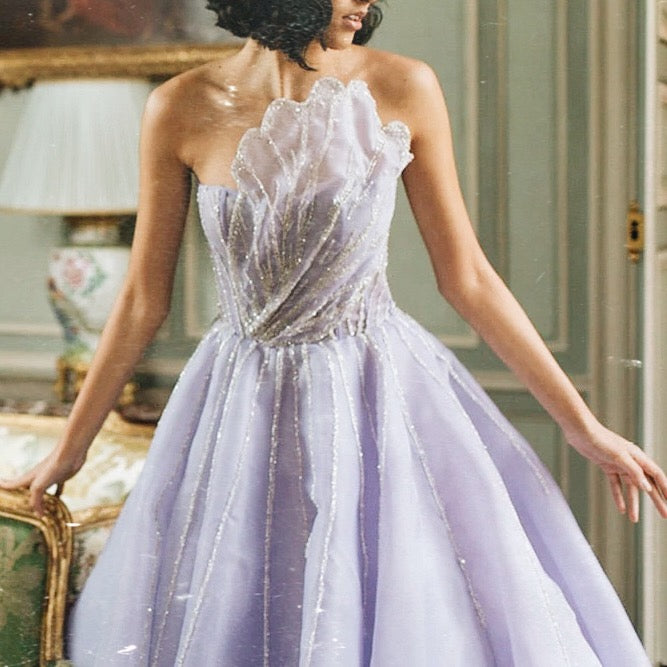 فستان راقي بتصميم بتلات ورد متموجه ومطرزه بطابع أنثوي