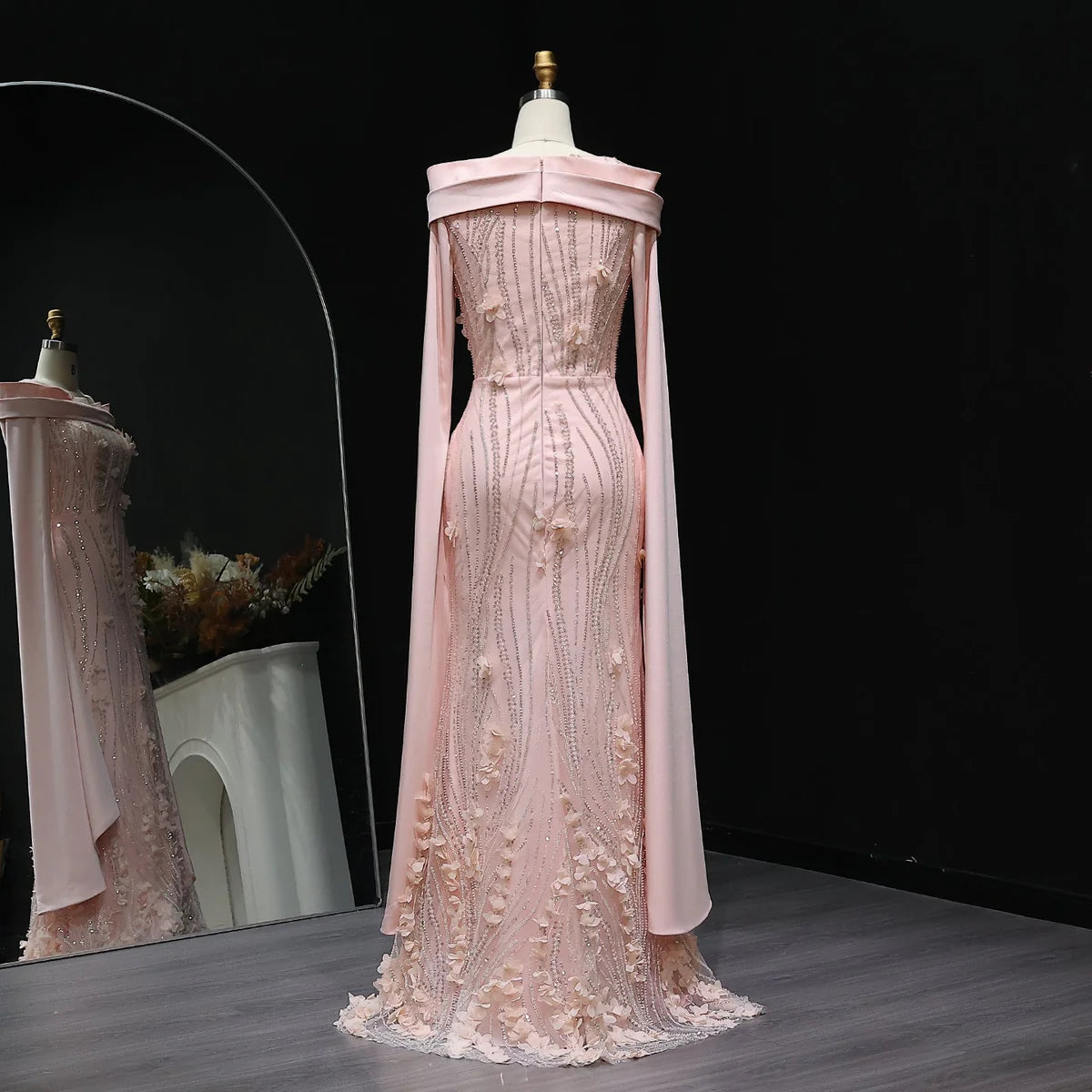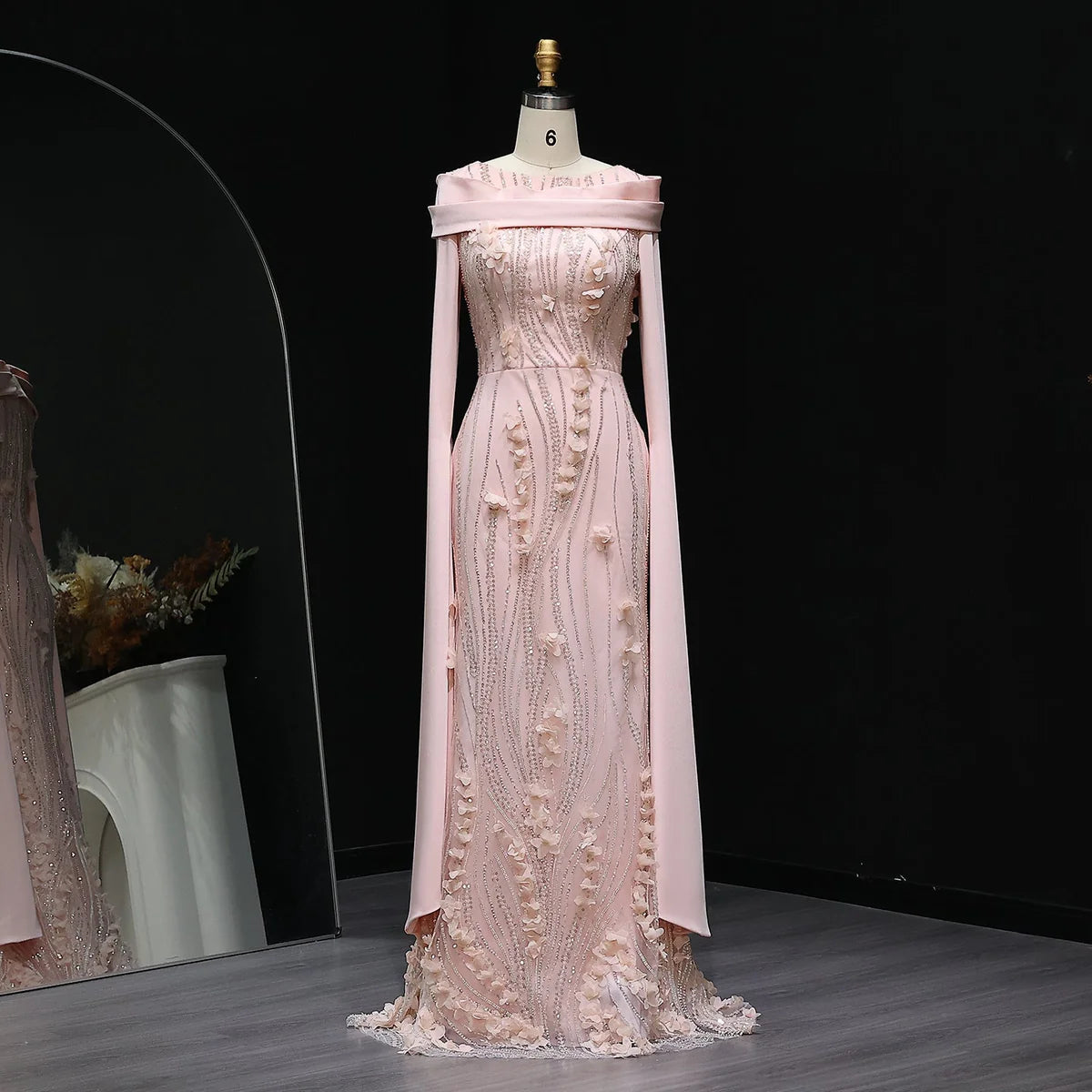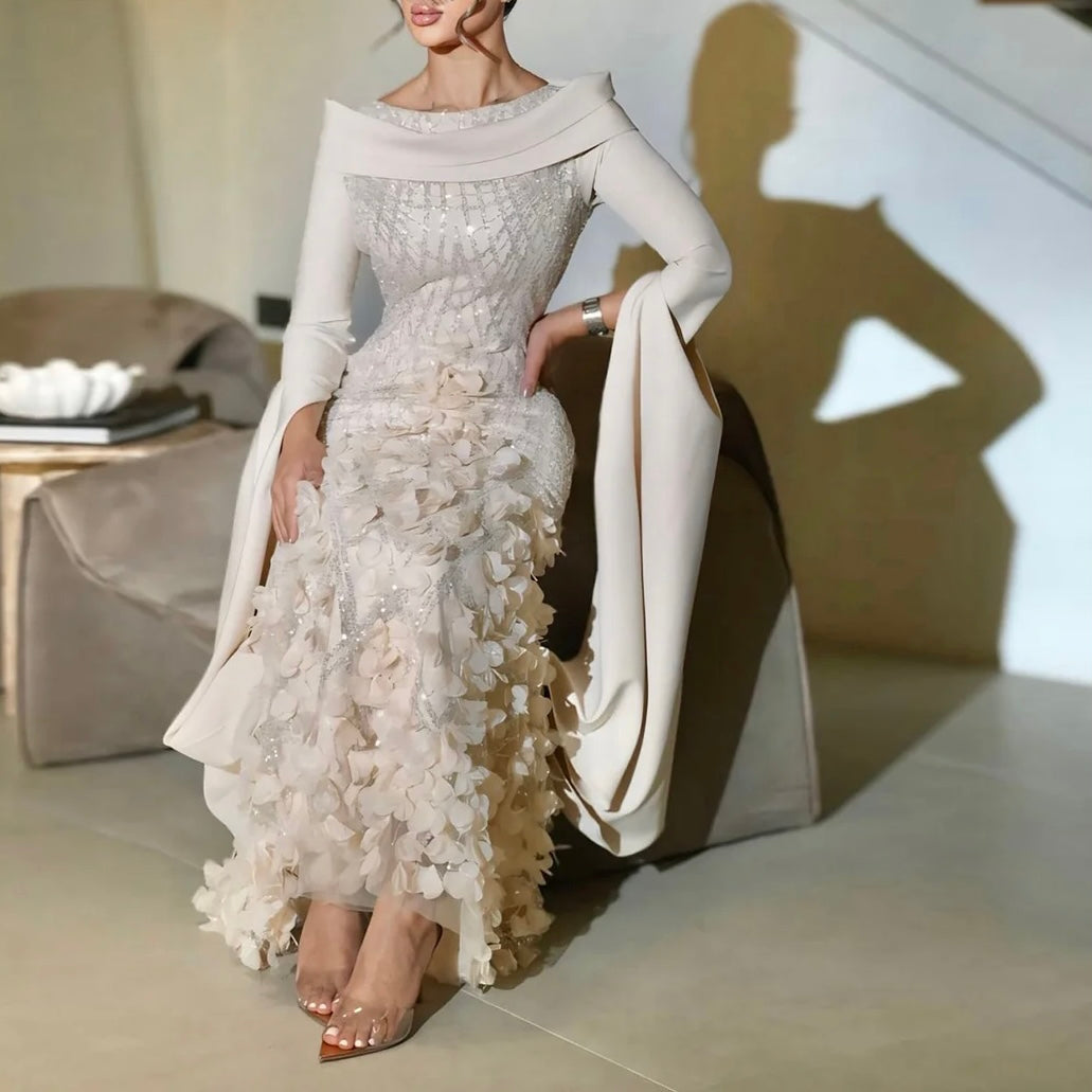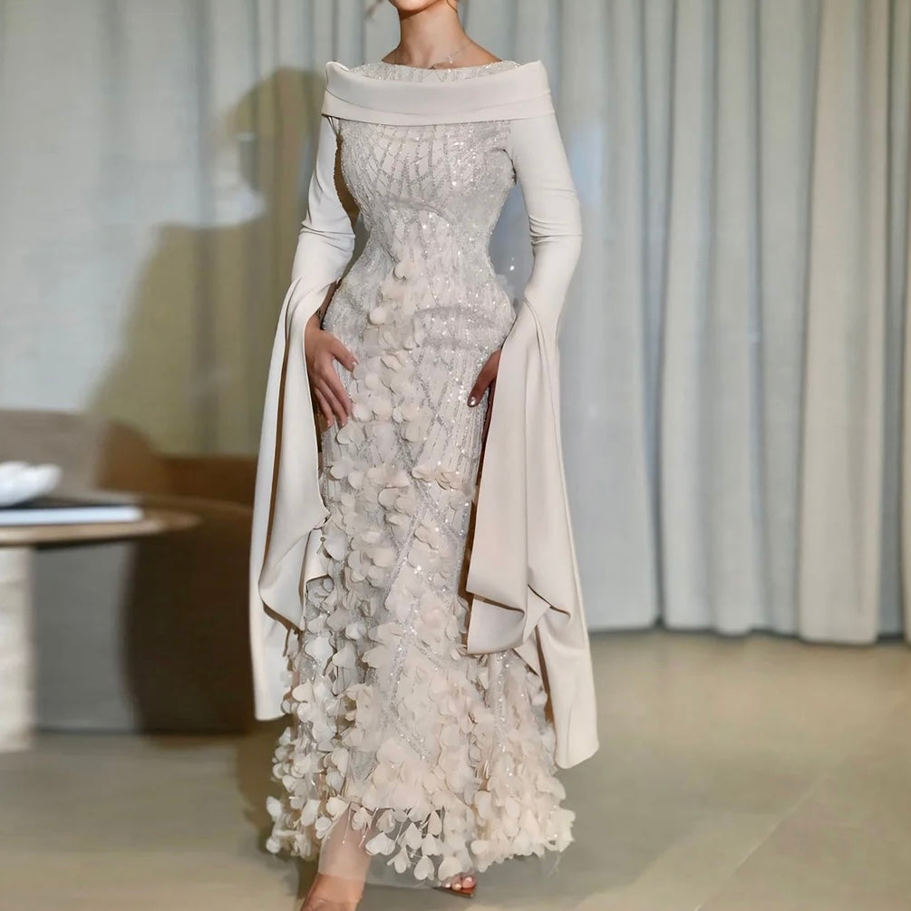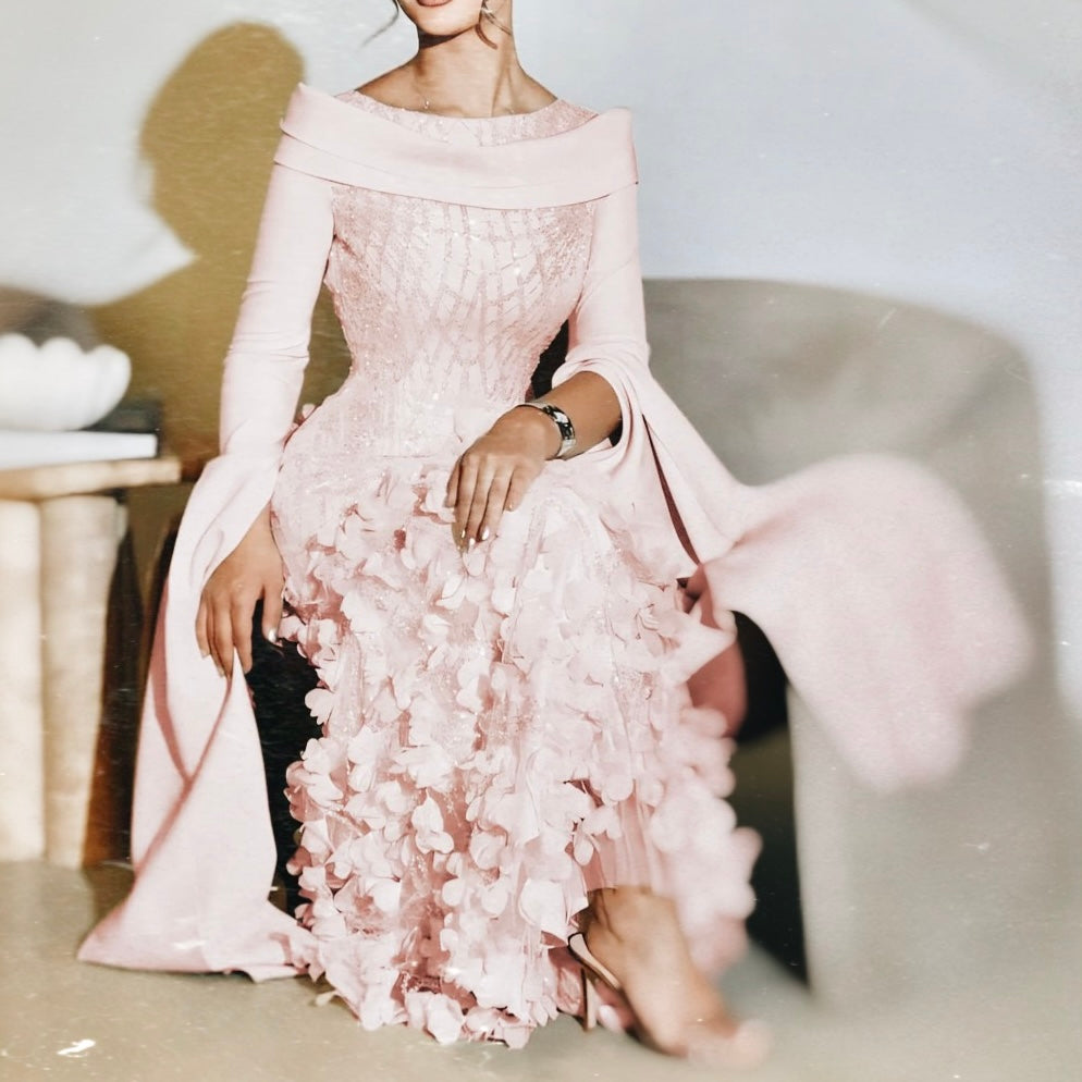 فستان فاخر بتطريز ورود بارزه وأكمام كايب