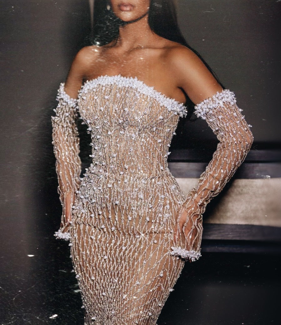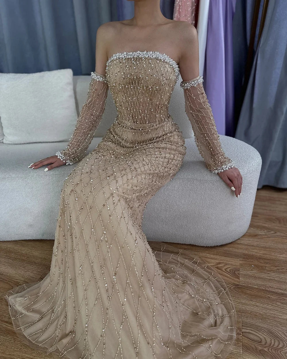 فستان بتصميم مميز وفاخر مطرز مع اكمام منفصله